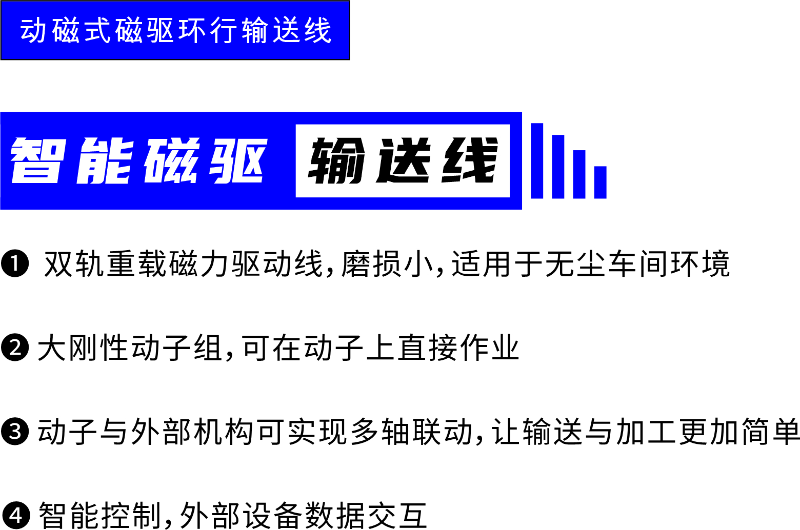 综上所述:柔性化能够满足未来产品的生产;实现零停机换型,可以在不同产品规格和加工流程之间实现自由转换;:高速高精密生产提高工厂生产率:降低不良率,减少浪费;支持小批次创新型产品的可盈利生产。而磁驱输送系统被业内认为是搭建柔性化产线的核心组成部分。