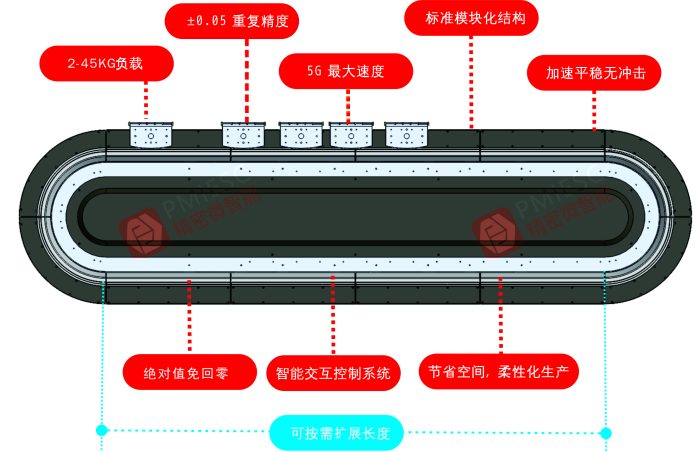 PTG智能输送线面向锂电、3C消费电子、半导体、汽车巴咨子医疗器械、液晶面板、智能物流、高端日用品、PCBA电子电等行业贯穿物料组装检测、输送等行业内的痛点,解决其生产女程莱灵活控制及可扩展性。采用长定子直线电t墨興画性化,超高效率、机岳过怅删世扎毋器驱动模组、电磁线圈的长定子轨道、永磁体动子滑块鼩州我等组成;驱动模组的动力输出,会让定子线圈在其轨/组交变磁场从而驱动轨道上永磁体动子快速运动,道实现对产上物料的传递与输送。