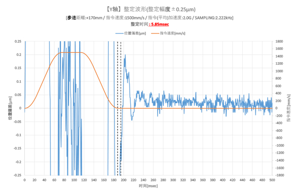 整定波形(整定幅度±0.25μm) 整定时间 : 29.3msec 步进距離:+170mm / 指令速度:1500mm/s / 指令(平均)加速度:2.0G / SAMPLING:2.222kHz
